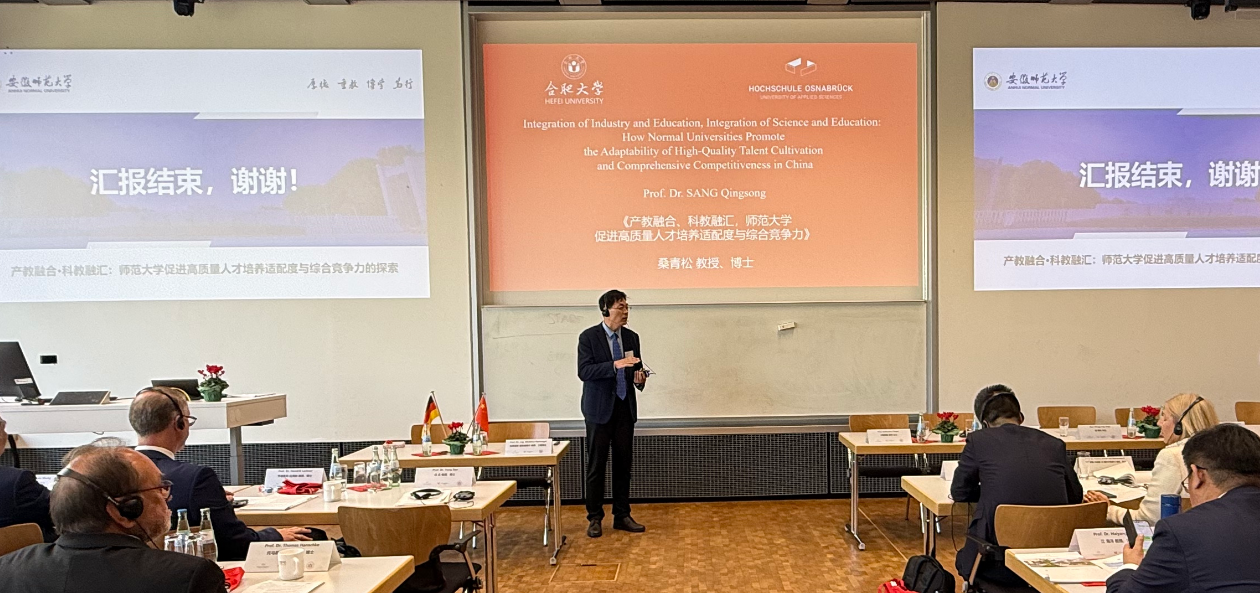 9月12日,第十八届中德应用型高等教育研讨会在奥斯纳布吕克应用科学大学举行,中德双方30余所高校、10余家企业代表参会。桑青松应邀作了题为“产教融合、科教融汇、师范大学促进高质量人才培养适配度与综合竞争力”的大会主旨报告,阐述了我校在人才培养方面的优势与举措。