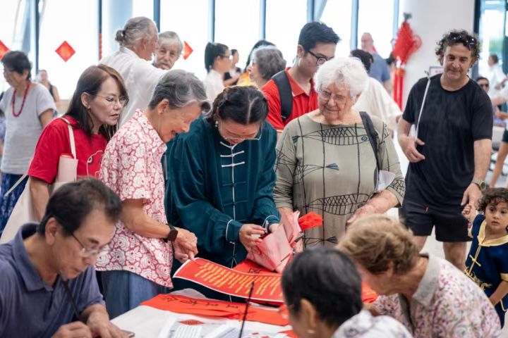 在这场文化盛宴中,孔子学院的老师们精心准备了丰富多彩的传统文化展示活动。书法展台前,老师们现场挥毫泼墨,为观众书写充满祝福的春联、“福”字以及“大吉大利”等各种新年祝福语,让澳大利亚朋友们近距离感受中国书法艺术的韵味。在剪纸展示区,薄薄的红纸在老师们灵巧的剪刀下变化成各种精美的图案,展现了中国传统手工艺的精湛技艺。