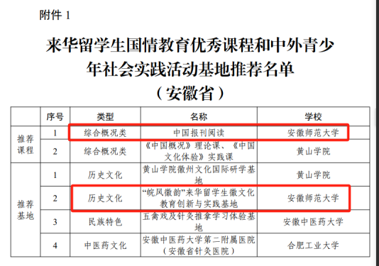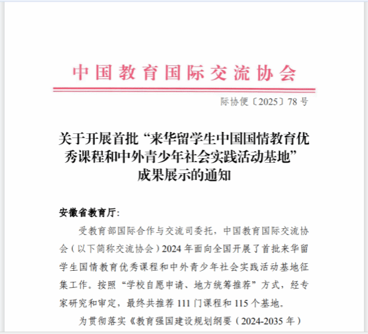 2024年,中国国际交流协会受教育部国际合作与交流司委托,面向全国开展了首批“来华留学生中国国情教育优秀课程和中外青少年社会实践活动基地”征集工作,并于近日公布了评选结果。我校国际教育学院《中国报刊阅读》课程和“‘皖风徽韵’来华留学生徽文化教育创新与实践基地”同时入选。
