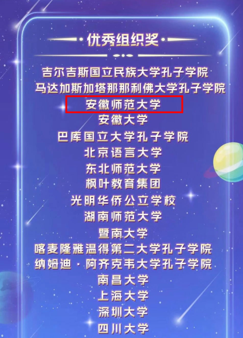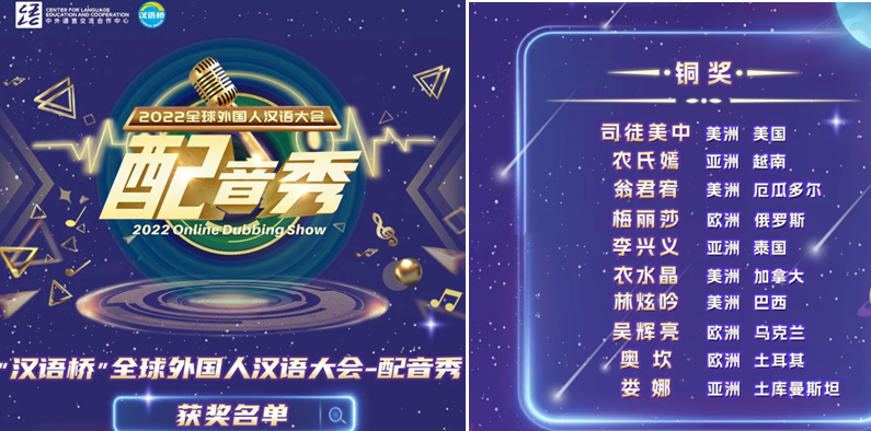 4月15日,中外语言交流合作中心公布了2022第八届“汉语桥”全球外国人汉语大会——配音秀的获奖名单,我校土库曼斯坦留学生娄娜获得铜奖,安徽师范大学荣获优秀组织奖。