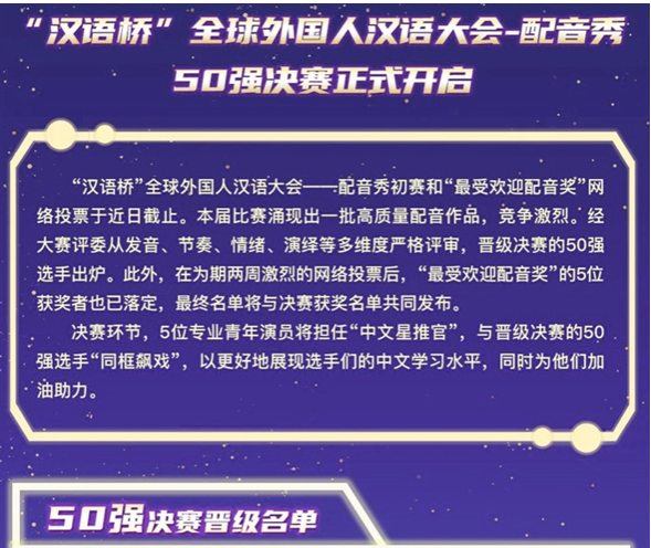 本届配音秀自2022年12月启动以来,受到海内外各大高校和华文教育机构的广泛关注,共有来自全球5大洲119个国家和地区230所院校的1502人报名,提交作品共1214个。我校共提交三件作品:土库曼斯坦留学生娄娜的《宸汐缘》、哈萨克斯坦留学生杰克的《流浪地球》、越南留学生黎琼云的《三生三世》。