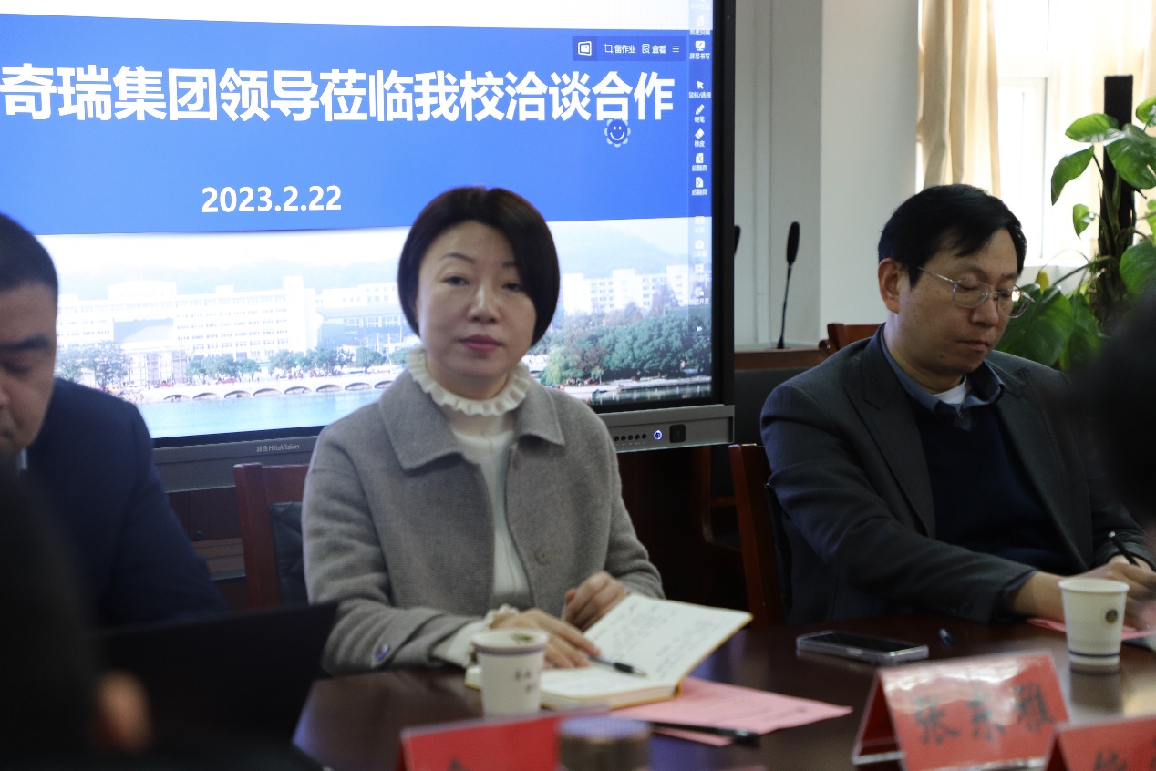 2月22日上午,芜湖奇瑞控股集团人力资源总监张东雅、奇瑞新能源人力资源总监周明、奇瑞商用车人力资源总监金武、奇瑞汽车股份有限公司人力资源部副部长毕全国、奇瑞控股集团招聘中心主任李伟一行5人来我校国际合作交流处(国际教育学院)在会议室就校企合作事宜进行座谈交流。学校党委常委、副校长熊宇杰,研究生院(研究生工作部)院长、部长桑青松,社会合作处(校友工作办公室)处长宋波、发展规划处(学科建设办公室)处长汪凯、国际合作交流处(国际教育学院)处长、院长张德让,副处长、副院长葛亚东参加会议。