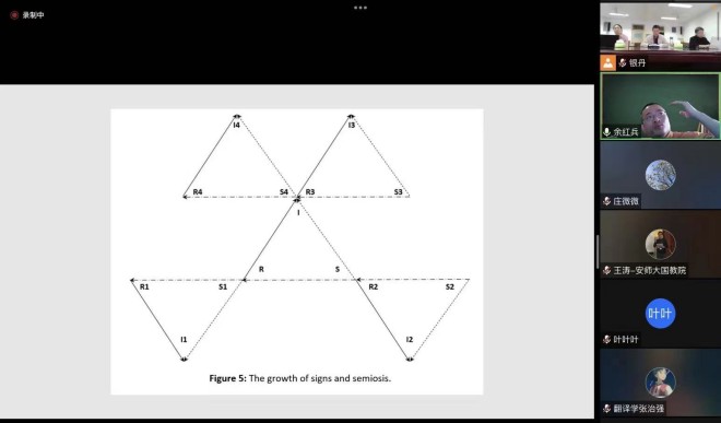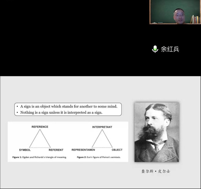 余红兵教授立足于西比奥克所言的符号学“大传统”,从核心概念semiosis出发,对人们常用的查尔斯·皮尔士(Peirce)的“符号三分法”进行追根溯源的阐释。同时,结合索绪尔、赵元任等人的相关理念,讨论了皮尔士符号学的哲学背景、基本原理和当代启示。余红兵教授的讲解条理清晰、生动有趣,对相关概念的阐释和例证展示深入浅出。讲座结束后,余教授对大家的疑惑一一耐心解答,现场互动气氛活跃,大家对皮尔士的符号学及其在实际领域中的应用有了更新的理解。
