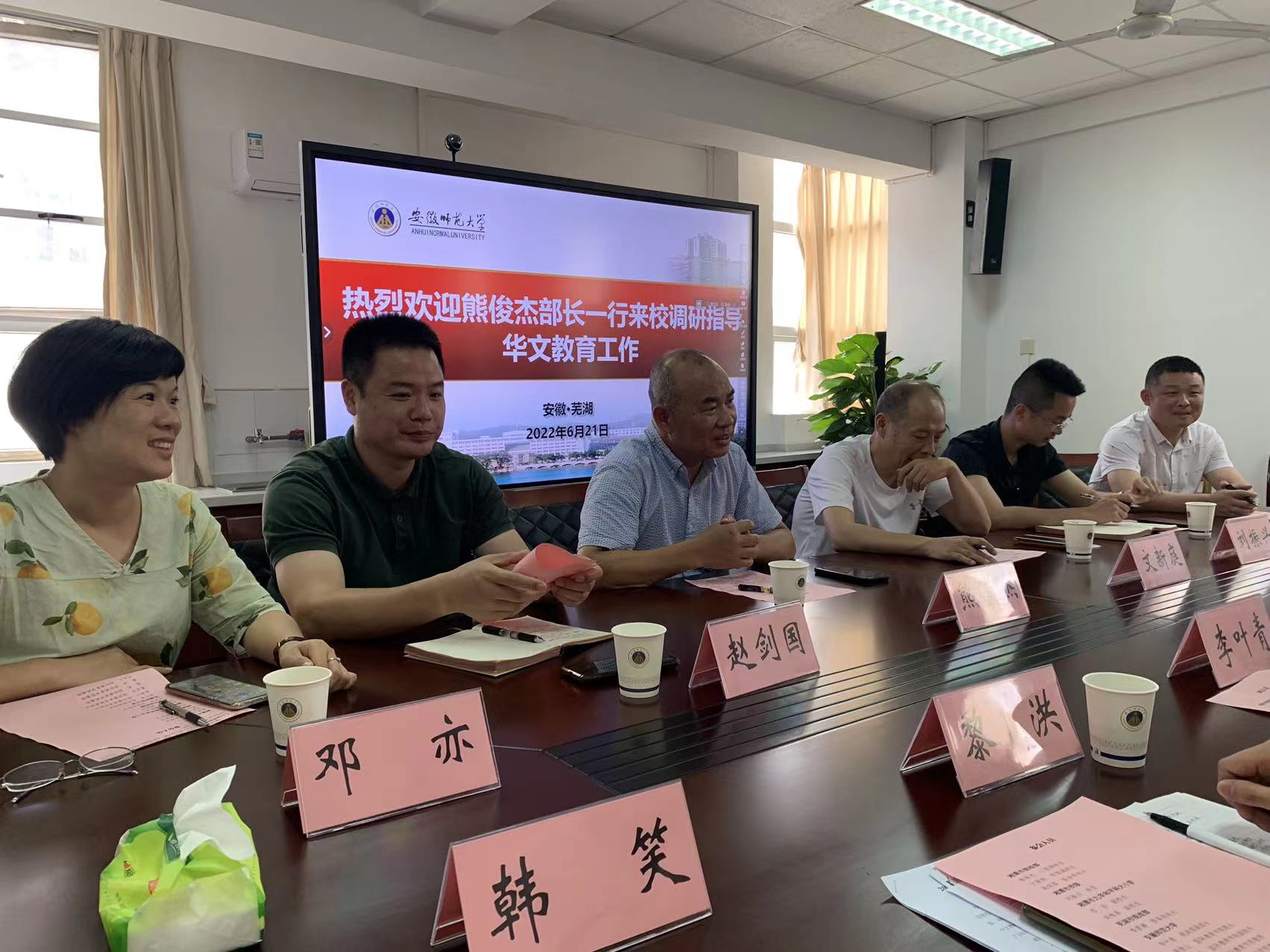 6月22日上午,湘潭市委统战部三级调研员熊俊杰、四级调研员文新庭等一行在芜湖市委统战部侨务科科长李君婷的陪同下来我校国际教育学院调研线上中华文化大乐园成功举办的经验。校统战部副部长李叶青、国际教育学院院长张德让、项目负责人黎洪、教师刘克云等参加了座谈。