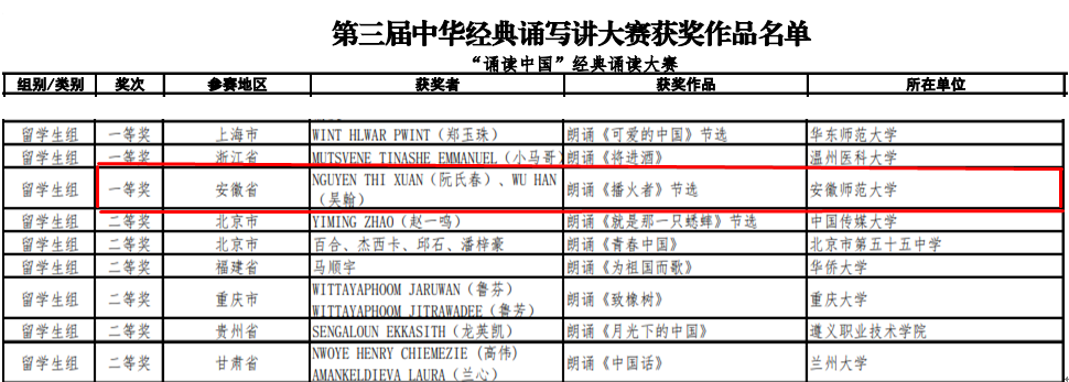 近日,教育部、国家语委公布第三届全国中华经典诵写讲大赛——“诵读中国”经典诵读大赛获奖名单,我校越南籍留学生阮氏春和比利时籍留学生吴翰继在安徽省比赛夺魁之后,一路过关斩将冲进全国总决赛,最终在半决赛朗诵红色经典《播火者(节选)》、总决赛表演《再别康桥》,再次勇拔头筹,夺得留学生组一等奖(全国仅3个),国际教育学院刘水老师获优秀指导教师。