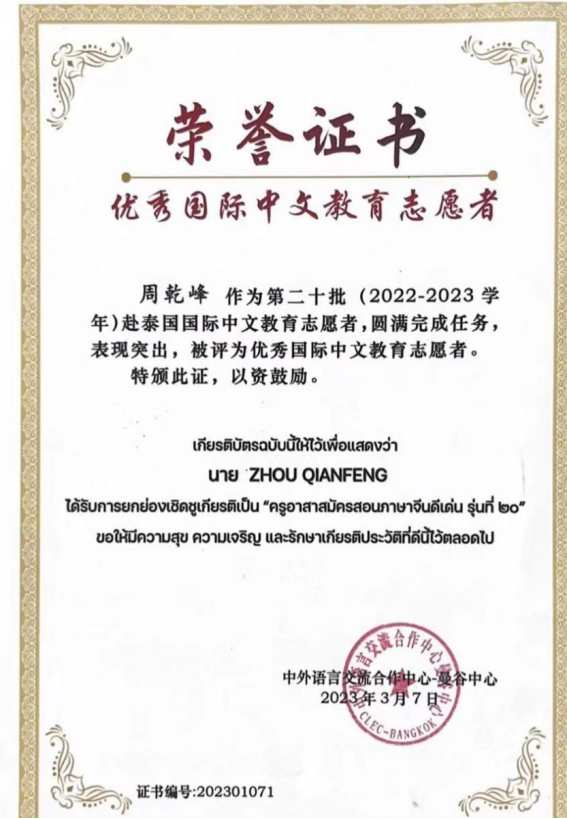 据悉,除赴泰志愿者项目,近5年来我校共为语合中心的普通志愿者项目成功派送赴柬埔寨志愿者5人,毛里求斯和韩国志愿者各2人,澳大利亚志愿者1人。此外,国交处还成功选拔了赴乌克兰孔子学院志愿者3人,波兰、澳大利亚和玻利维亚孔子学院志愿者各1人。这些国际中文教师志愿者在世界各地传播中文和中华优秀文化,其中有多人获得“全球孔子学院先进个人”和“优秀国际中文教育志愿者”等荣誉称号,展现出新时代青年人的朝气与自信,也展示出安徽师大学子的良好精神风貌。