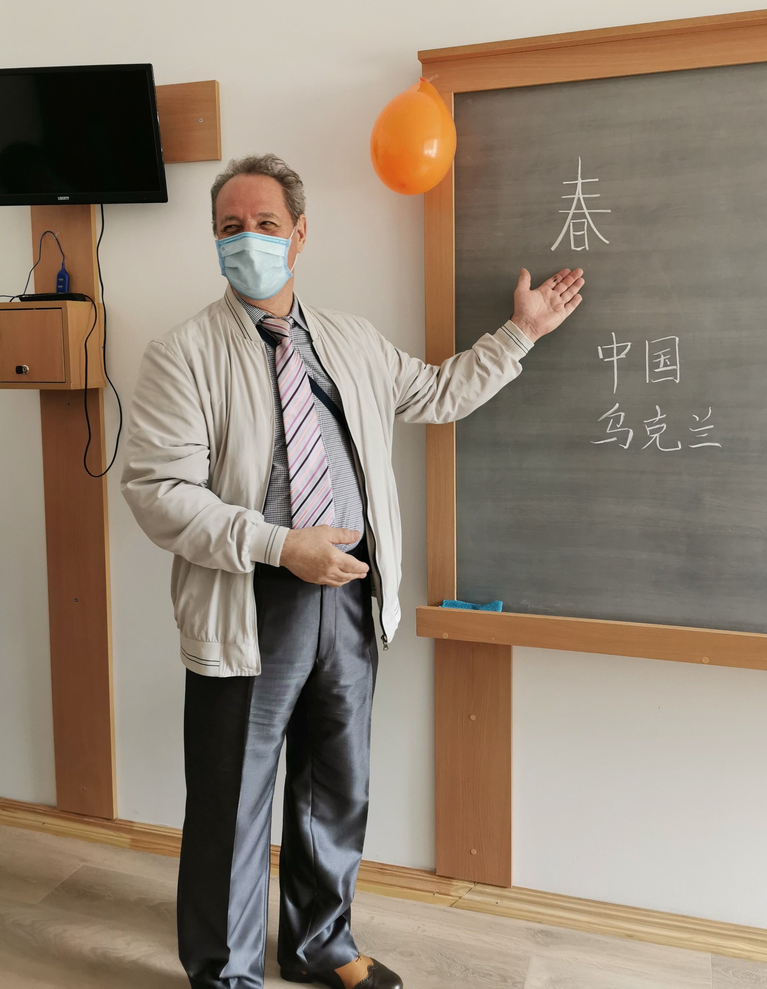 弗拉基米尔彼得洛维奇沃尔科夫教授,身材魁梧、高大、健硕,学识渊博,精力充沛,和蔼可亲,看上去根本不像70多岁的老人。他是乌克兰著名的教育家,曾任扎波罗热国立大学副校长,获得过乌克兰总统签发的教育部功勋奖章。2018年光荣退休后,他欣然接受了学校返聘,担任乌克兰扎波罗热国立大学孔子课堂首任外方院长。虽年逾古稀,他仍积极努力工作,为孔子课堂的建设和发展,殚精竭虑,四处奔波。走进沃尔科夫院长的办公室,你会感受到一股浓浓的中国文化氛围。桌子上插着中乌两国的国旗,墙上挂着中国山水画、花鸟画,天花板悬挂着来自中国的红灯笼和中国结,柜门上贴着京剧脸谱和各种字体的字。他的办公桌旁还挂着一块黑板,每天他都坚持练习写汉字,最喜爱写的是字。沃尔科夫院长一见到客人,就会向他们展示他的书法,并认真地书写一个大大的字,向客人推介奇妙的汉字书法艺术,夸耀中国的大美山川和文化历史遗迹。