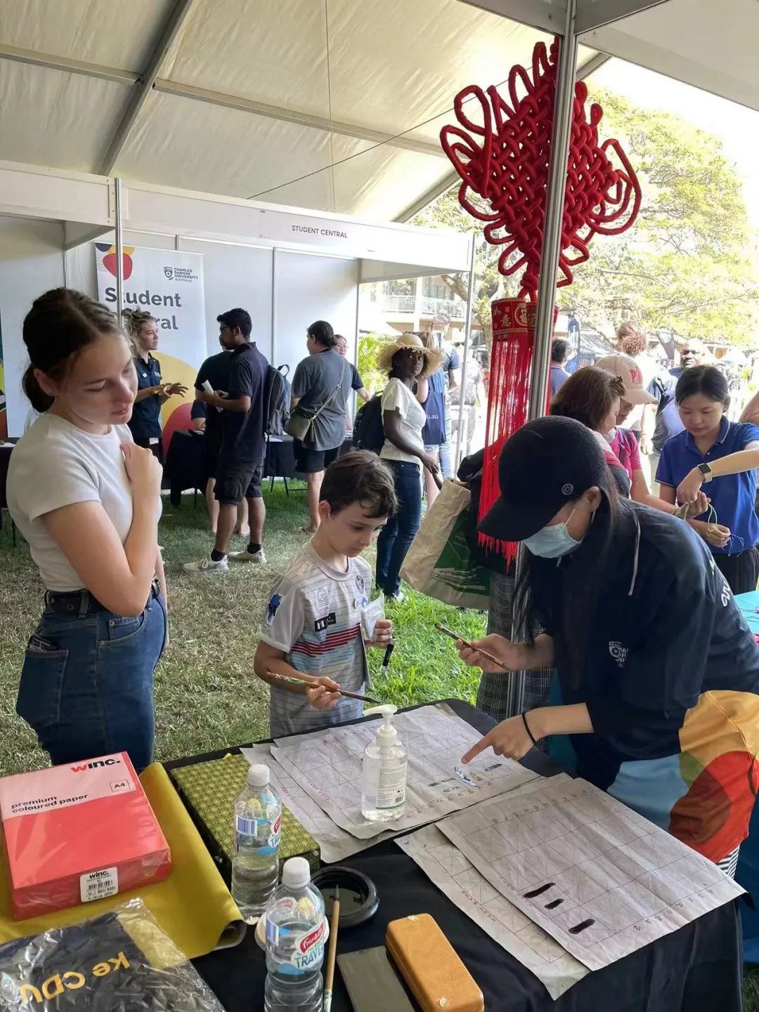 本次开放日中,孔子学院主要推介的项目有编中国结与写书法,这两项主题活动都传递了中国文化中的“福气”、“喜庆”内涵。往来的游客被展台上的红色中国结以及孔院老师和志愿者手中的彩色丝线所吸引,纷纷驻足观看并积极参与其中,认真地学习着每一个步骤。另一边,写书法活动也有序开展,路过的游人对方块字产生了浓厚兴趣。孔院的老师与志愿者铺开书写纸,一笔一划地教,体验者有模有样地学,十几笔下来,一个字就写好了。游人们为自己的作品拍照留念并不停感叹汉字的神奇。