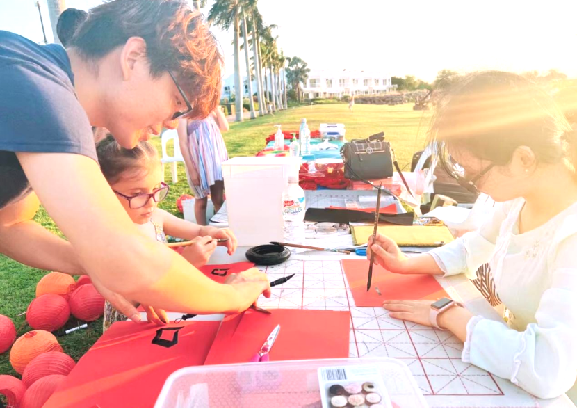 在节目表演环节中,华人舞蹈队带来的古典舞引得不少游客纷纷拍照;孔院志愿者老师韩向远和高若瑶展示的书法和国画吸引了大家的目光,在场嘉宾争相体验毛笔书画;海外志愿者Niki指导小朋友玩用筷子夹巧克力豆的游戏成功吸引了孩子们的眼球;海外志愿者Debora和Bamboo老师带领小朋友们绘制的特色灯笼点亮了海滩的夜色;公派教师Lucy和行政官员Joey用各种颜色的绳子编织出别致的中国结也吸引了不少游客前来学习……丰富多样的中国文化体验活动,给到场的宾客奉上了一场中秋盛宴。