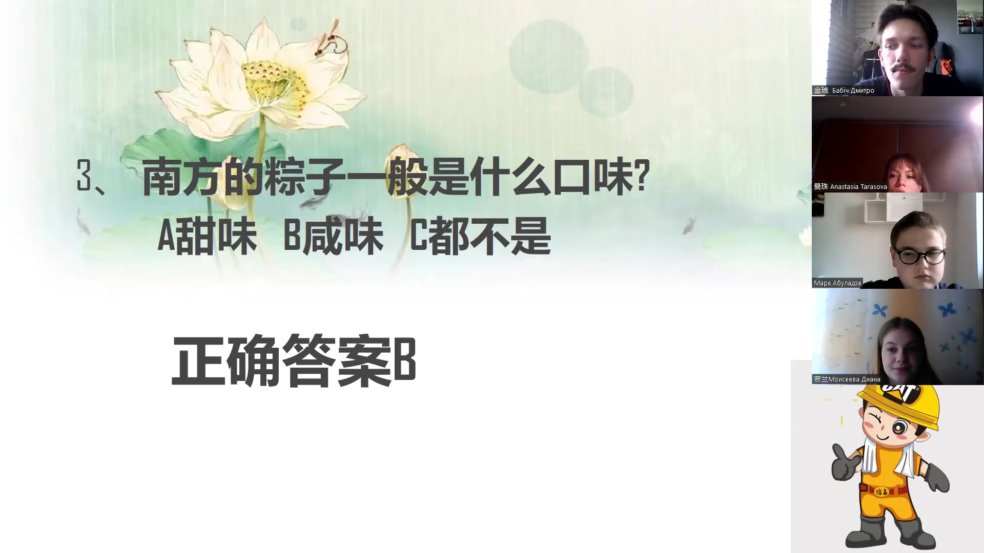 活动由扎波罗热国立大学中文系大二学生美丽和秋香主持,共分四个环节。首先,两位主持人用流利的中乌双语介绍端午知识;接下来,老师们播放自制短视频,让学生云端体验芜湖端午节的习俗;在第三个环节中,十二位同学分别朗诵有关端午节的古典和现当代诗歌。其中,大学生若兰和小学生马克以标准的发音、拥有感情的朗诵分别获得专业组和兴趣组第一名;在最后的有奖竞猜趣味活动环节中,多位同学纷纷抢答,气氛热烈,将活动推向高潮。活动结束后,老师们制作了精美的电子奖状,云端传送给主持人及所有获奖同学。