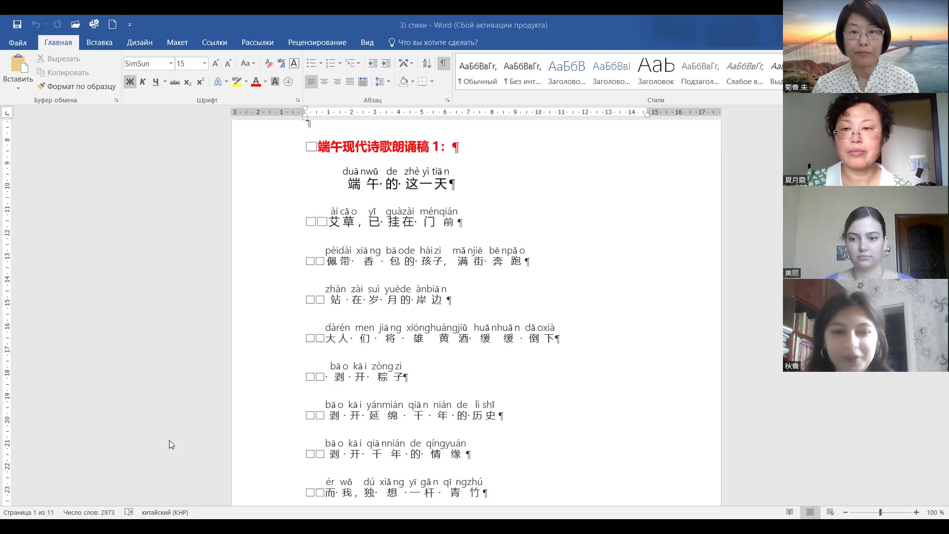 2022年6月3日端午节当天,扎波罗热国立大学孔子课堂举办了“端午知识知多少——端午诗歌朗诵暨有奖竞猜”云上端午活动。校国际交流合作处副处长杜俊应邀参加了此次活动。她首先给课堂参加本次活动的所有师生送上节日祝福,表达了对孔子课堂全体师生的关切,并鼓励大家在战时继续学好汉语。
