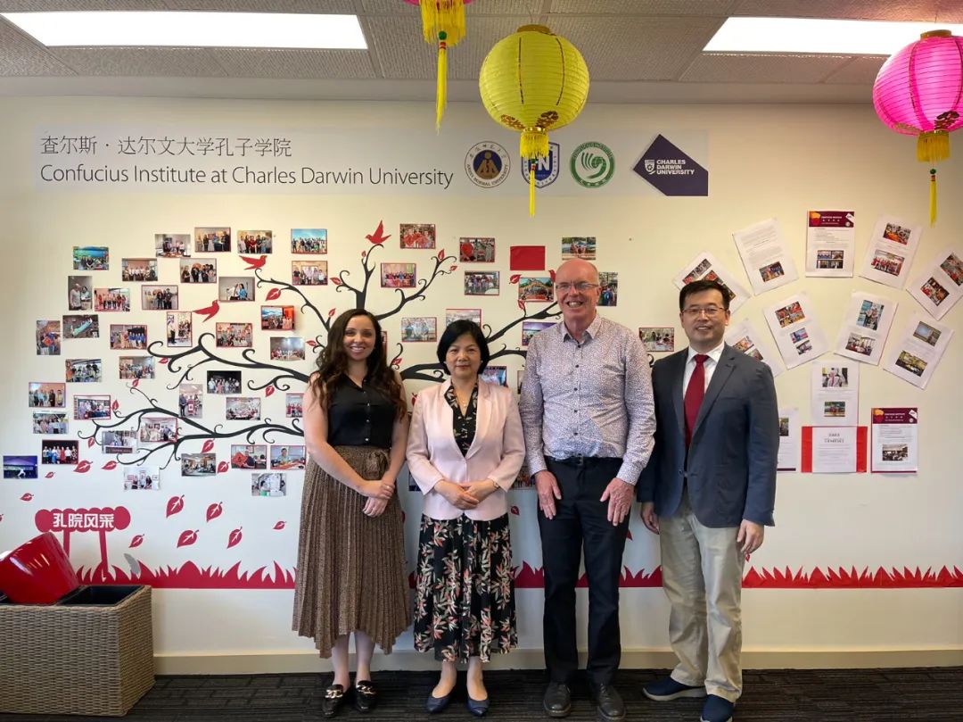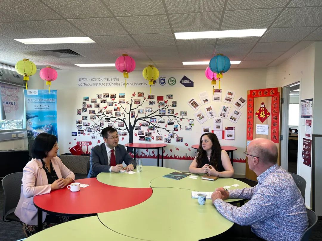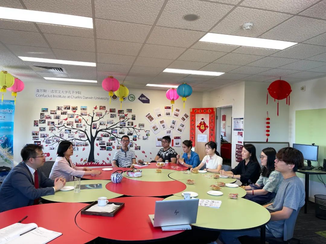 9月8日,中国驻澳大利亚大使馆郭骄阳公参一行到访查尔斯·达尔文大学孔子学院,与外方院长David James Young、中方院长赵志清,以及查尔斯·达尔文大学国际学生办公室负责人Joanne Crystal女士进行了会谈,并在会谈结束后与公派汉语教师、海外志愿者等孔院教师进行了座谈。