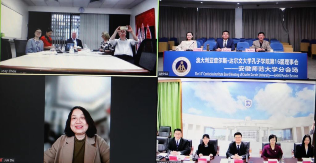 本网讯(国际交流合作处 李一鸣)12月9日,查尔斯·达尔文大学孔子学院第十六届理事会召开。因疫情原因,会议采取会议视频进行,分别在澳大利亚查尔斯·达尔文大学、安徽师范大学和海南大学分会场同时进行。校党委常委、副校长任永,查尔斯·达尔文大学副校长杰妮·罗伯茨女士,海南大学副校长叶光亮出席会议,三校孔子学院理事会成员及学校相关部门负责人参加会议。