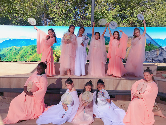 School)的学生在校级晨会上表演中国古典舞蹈《雨中花》,全校四百多位师生到场观看。此次演出还吸引了部分学生家长和当地民众现场观看和体验。