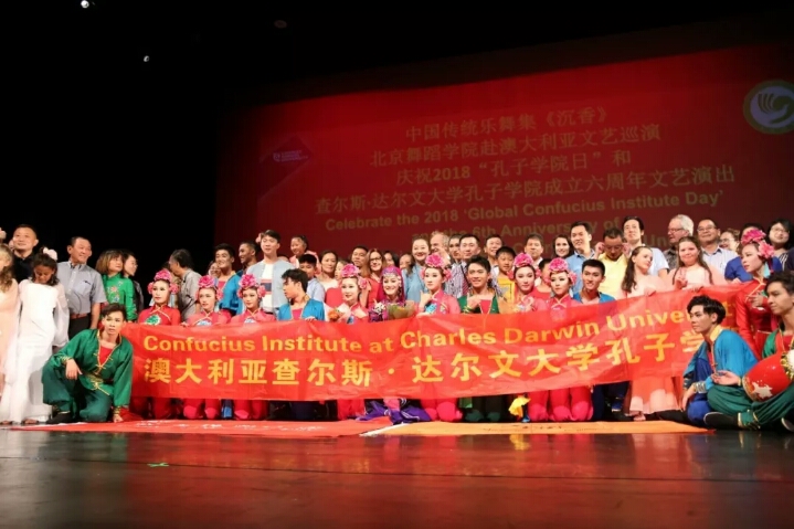 中华人民共和国国庆节前夕,澳大利亚北领地当地时间9月28日晚7点半,为热烈庆祝全球孔院日暨查尔斯·达尔文大学孔子学院成立6周年,在查尔斯·达尔文大学孔子学院精心安排和策划下,北京舞蹈学院中国民族民间舞系师生在澳大利亚达尔文演艺中心,为当地观众奉献了一场精彩的演出。千人演艺厅坐无虚席。
