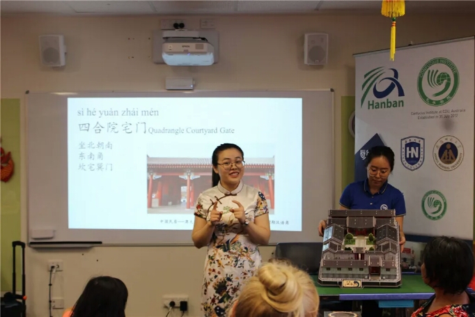 当地时间11月9日,澳大利亚查尔斯·达尔文大学孔子学院举办汉语角系列活动之“中国民居”。达尔文市帕拉普小学老师辛蒂·布伦南(Cindy Brennan)、学生代表里卡德·斯托贝尔(Ricard